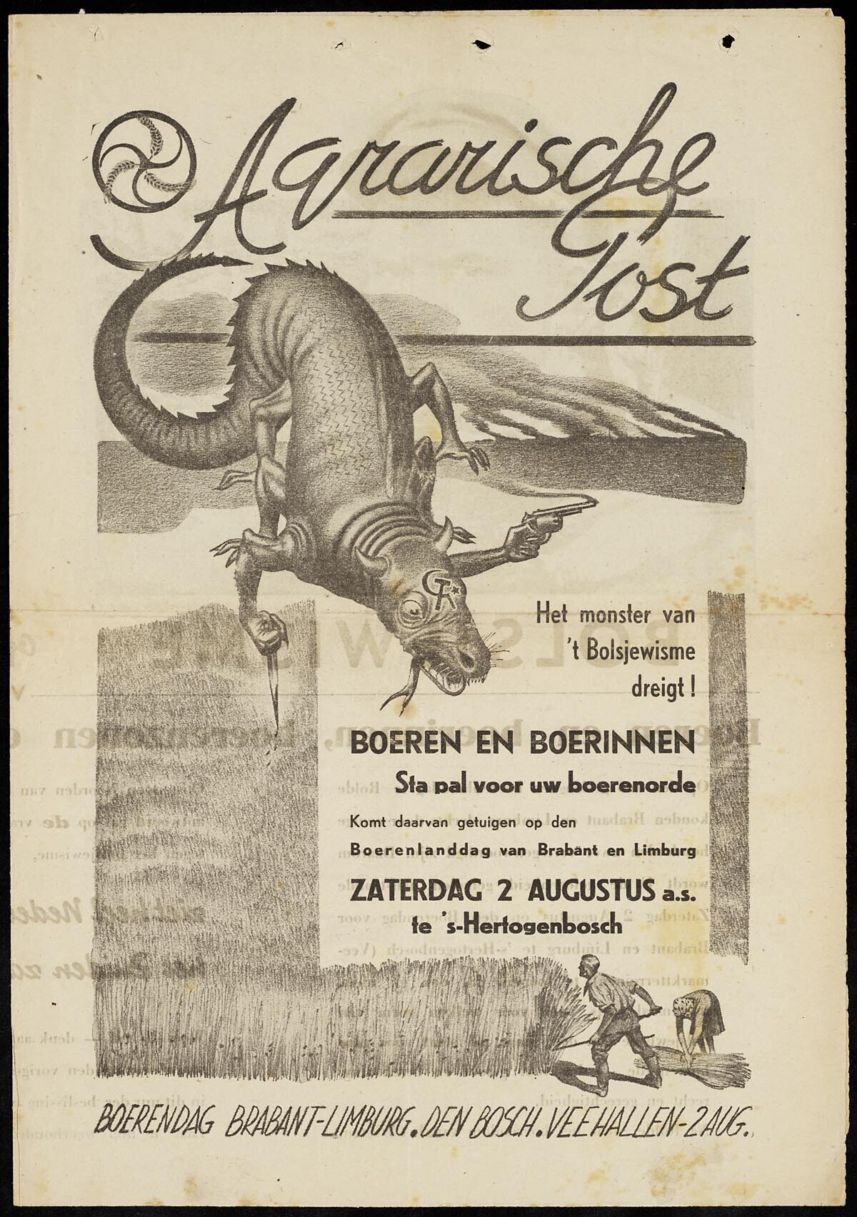 Een uitgave van de Agrarische Post een weekblad van het pro-Duitse Nederlandsch Agrarisch Front. Op de voorpagina is links van de titel het embleem van het Nederlandsch Agrarisch Front: aren in een spiraalvorm. Hieronder een draak met op zijn kop het symbool van het bolsjewisme: hamer en sikkel. In zijn klauwen heeft het een pistool en een dolk en bedreigt een boer en boerin die graanoogsten. Hierbij de oproep: om naar de boerenlanddag voor Brabant en Limburg in Den Bosch te komen op zaterdag 2 augustus 1941.
