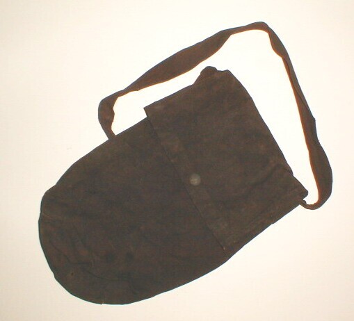 Een bruine linnen tas met een draagband en klepsluiting door een drukkoopje. Werd vermoedelijk in Nederland gebruikt door burgers voor het opbergen van een gasmasker.