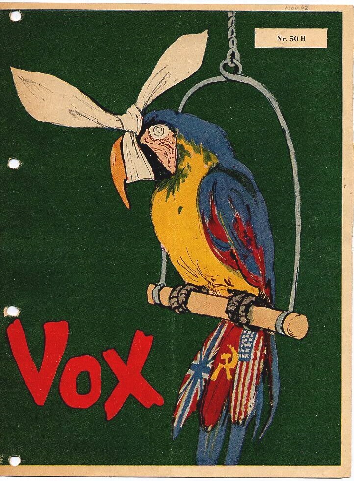 Het tegen de geallieerden gericht satirische tijdschrift Vox no. 50H. Op de frontpagina een papegaai op stok waarvan de bek is gesnoerd met een lap. In de staart de vlaggen van Engeland, Rusland en Amerika. Het tijdschrift is drietalig: Nederlands, Frans en Engels.