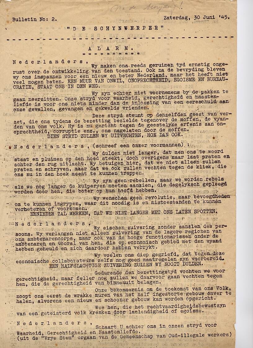Een gestencild bulletin nummer twee van het krantje 'De Schijnwerper' over de aanpak van "foute" Nederlanders. Er is een voorbeeld van een aangepast visitekaartje voor deze personen.