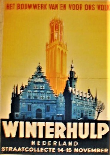 Een affiche (no. 15) met rode, witte, blauwe en zwarte opdruk tegen een gele achtergrond van de Winterhulp Nederland met een oproep te doneren tijdens de collecte van 14 - 15 november. Afgebeeld zijn historische gebouwen in Nederland.