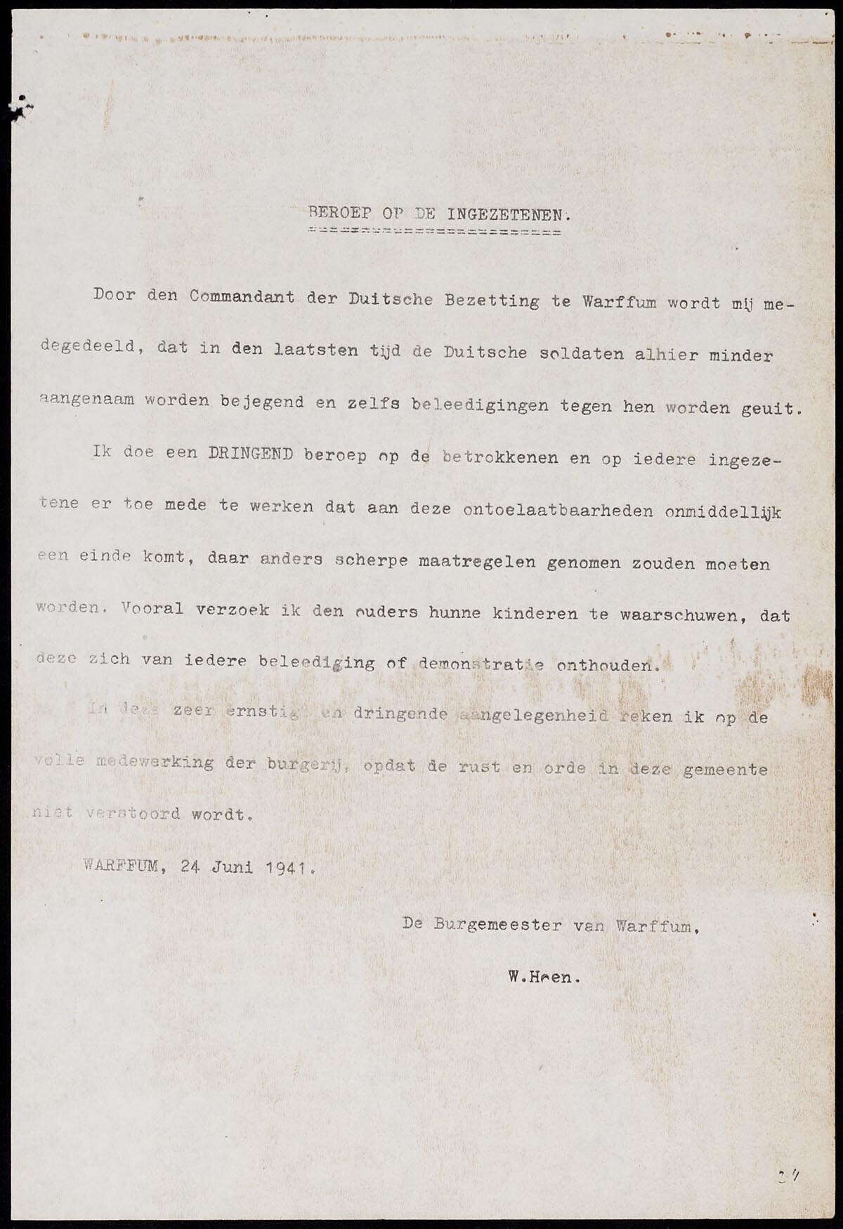 Oproep aan de burgers van Warffum zich beter te gedragen tegenover de Duitse bezetter.