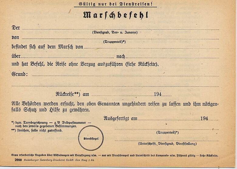 Twee blanco invulformulieren met betrekking tot dienstreizen. Op de achterzijde een reglement In gotisch schrift.