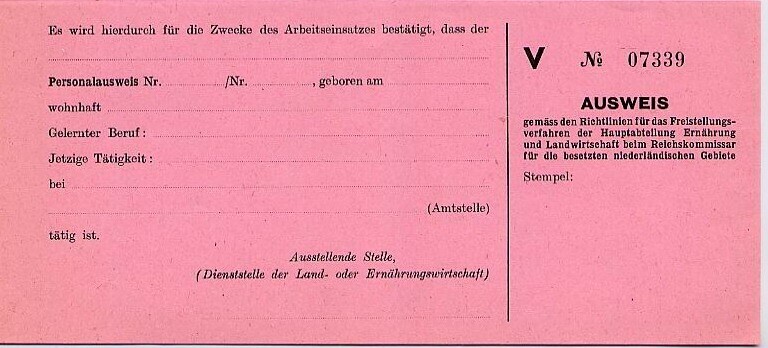 Oningevuld roze formulier waarin voor het doel van de Arbeidsinzet wordt verklaard dat een persoon een bepaalde opleiding en betrekking heeft.
