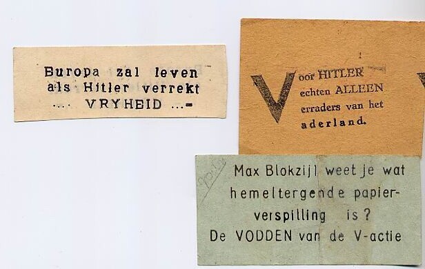 Drie aan twee kanten gestempelde pamfletjes met verzetsteksten als reaktie op de 'V-actie': "V rijheid, V rede en brood wanneer het Fascisme is Dood; V oor Hitler V echten alleen V erraders van het V aderland; Max Blokzijl weet je wat hemeltergende papierverspilling is? De vodden van de V-actie; Europa zal leven al Hitler verrekt ... Vrijheid ...".