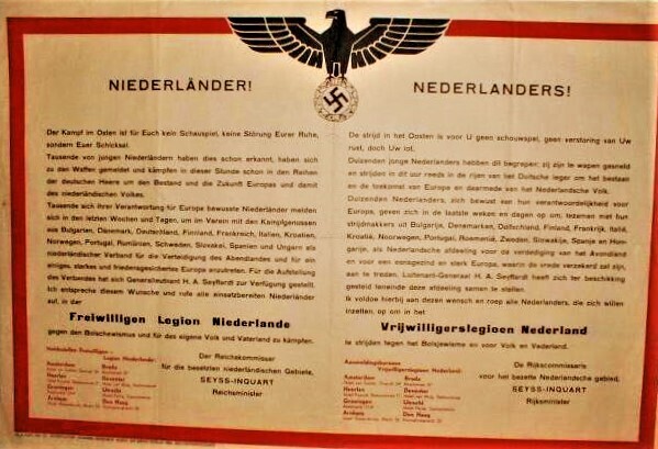 Een affiche met daarop een oproep van Rijkscommissaris Seyss-Inquart aan Nederlanders om dienst te nemen bij het Vrijwilligers Legioen Nederland in verband met de strijd tegen het bolsjewisme. De tekst is in het Duits en in het Nederlands opgesteld. In het midden bovenaan de Duitse rijksadelaar met het hakenkruis in de klauwen.