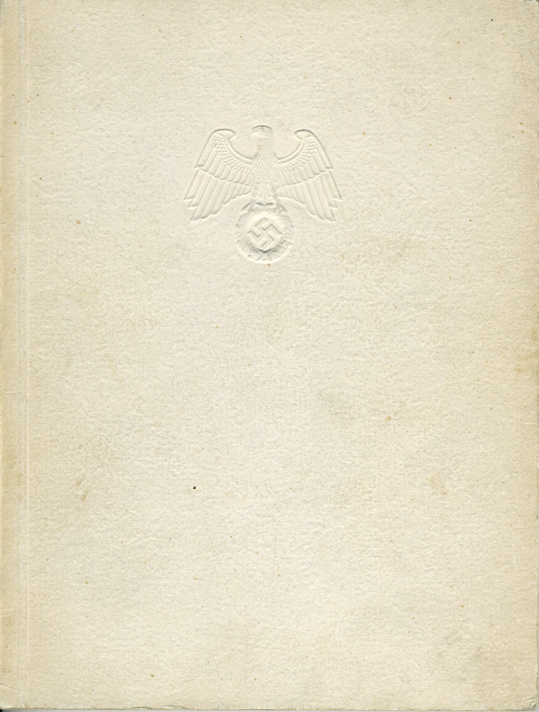 Een tentoonstellingscatalogus met een witte papieren kaft met daarop in reliëf de afbeelding van de Duitse rijksadelaar met hakenkruis. Het gaat om een overzicht van een tentoonstelling van hedendaagse kunst uit Westfalen-Nederrijn die in Amsterdam werd gehouden van 2 augustus tot en met 14 september 1941. Beschermheer: "Rijskcommissaris Rijksminister Dr. Seyss-Inquart". De catalogus bevat veel zwartwit afbeeldingen en beschrijvingen van de kunstobjecten.