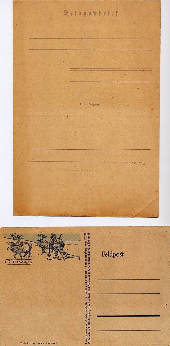 Set van drie enveloppes en een voor Duitse militairen. Op de briefkaart linksboven een prentje van een soldaat op skiën en twee rendieren met daaronder: "Geleitzug".