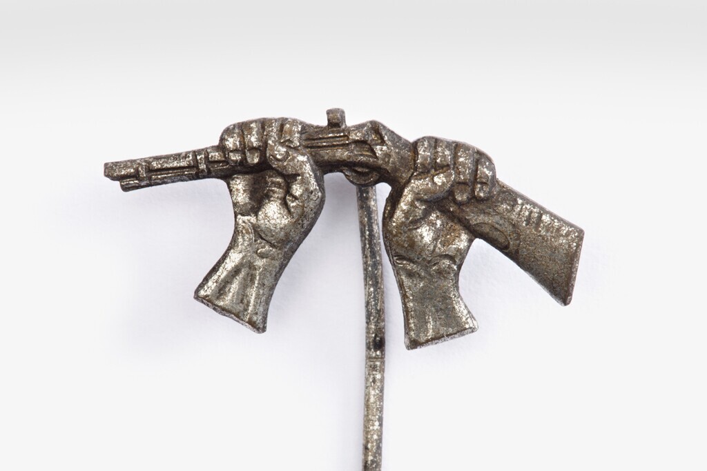 Een zilverkleurig metalen reversspeldje "Gebroken geweer" met de afbeelding van handen die de loop van een geweer breken.
