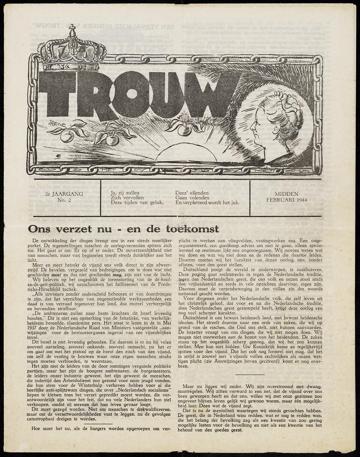 Exemplaar van de illegale krant Trouw, het betreft nummer 2 van de tweede jaargang van midden februari 1944. Op de voorpagina een artikel over het verzet.