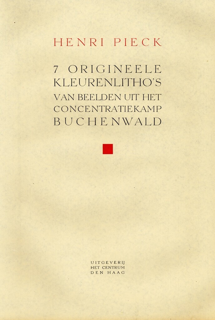 Zeven kleurenlitho's van beelden uit het concentratiekamp Buchenwald in grijze omslag.