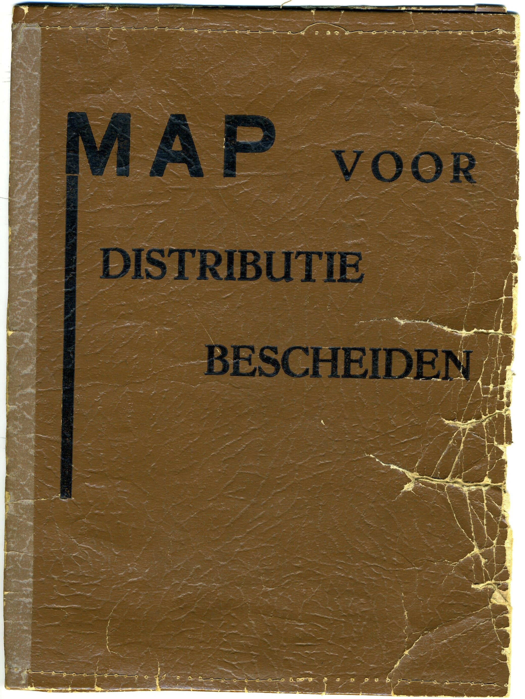 Bruine map voor het rangschikken van verschillende distributiebonnen. Op de voorzijde in zwarte opdruk: "Map voor distributie bescheiden''. In de map zijn enkele bonnen aanwezig.