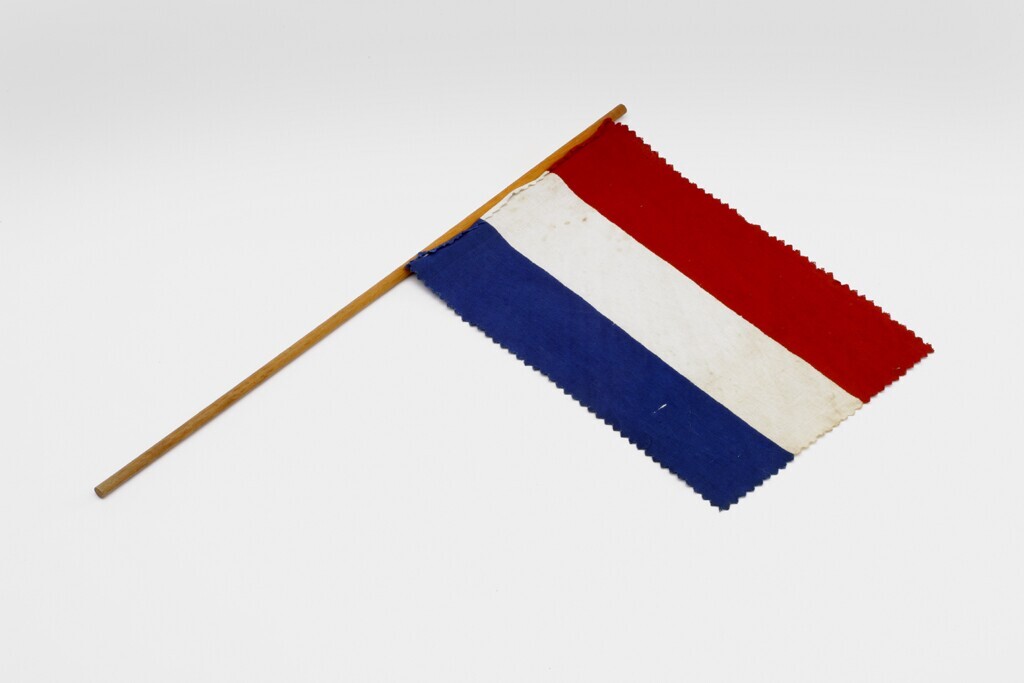 Een linnen vlag aan een houten stokje gemaakt om de bevrijding te vieren. De vlag is bedrukt in de Nederlandse driekleur en het stokje is oranje geverfd.