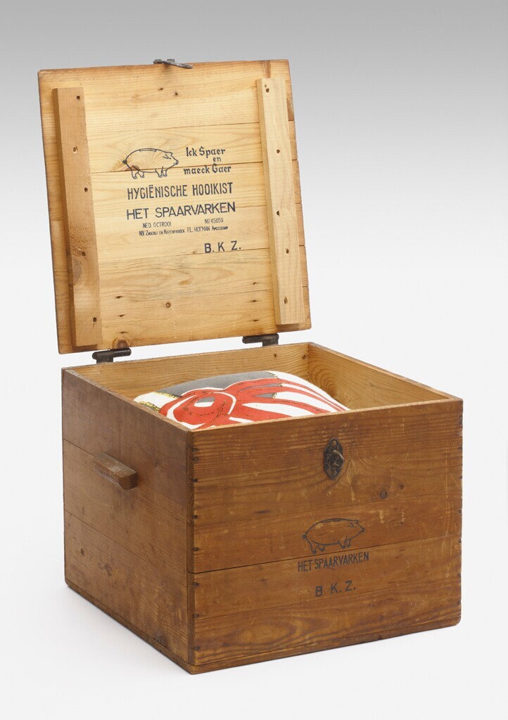 Een vierkante bruin houten kist met zwartgelakt metalen scharnieren en sluiting voor een hangslot. Aan beide zijkanten houten handgrepen. Aan de binnenkant van het deksel de afbeelding in blauwe inkt van een varken en: "Ick Spaer en maeck Gaer. Hygiënische Hooikist Het Spaarvarken. Ned. Octrooi no. 45659. N.V. Zagerij en Kistenfabriek F.L. Hofman Amsterdam. B.K.Z." In de kist een ronde metalen ring, bespannen met jute met een versiering, waarin een speld steekt. Hierboven een in de rondte gevouwen langwerpig kussen gevuld met hooi. In het midden een geëmailleerde pan met deksel (collectienummer 89185). Hier bovenop een klein kussen gevuld met hooi.
