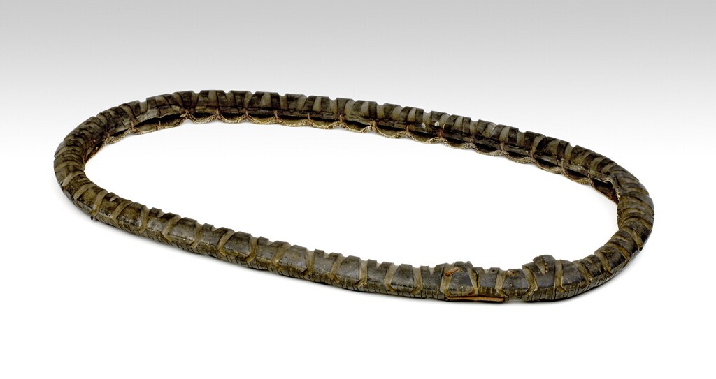 Fietsband gemaakt van het materiaal van een autoband en bijeengehouden door metalen pinnen.