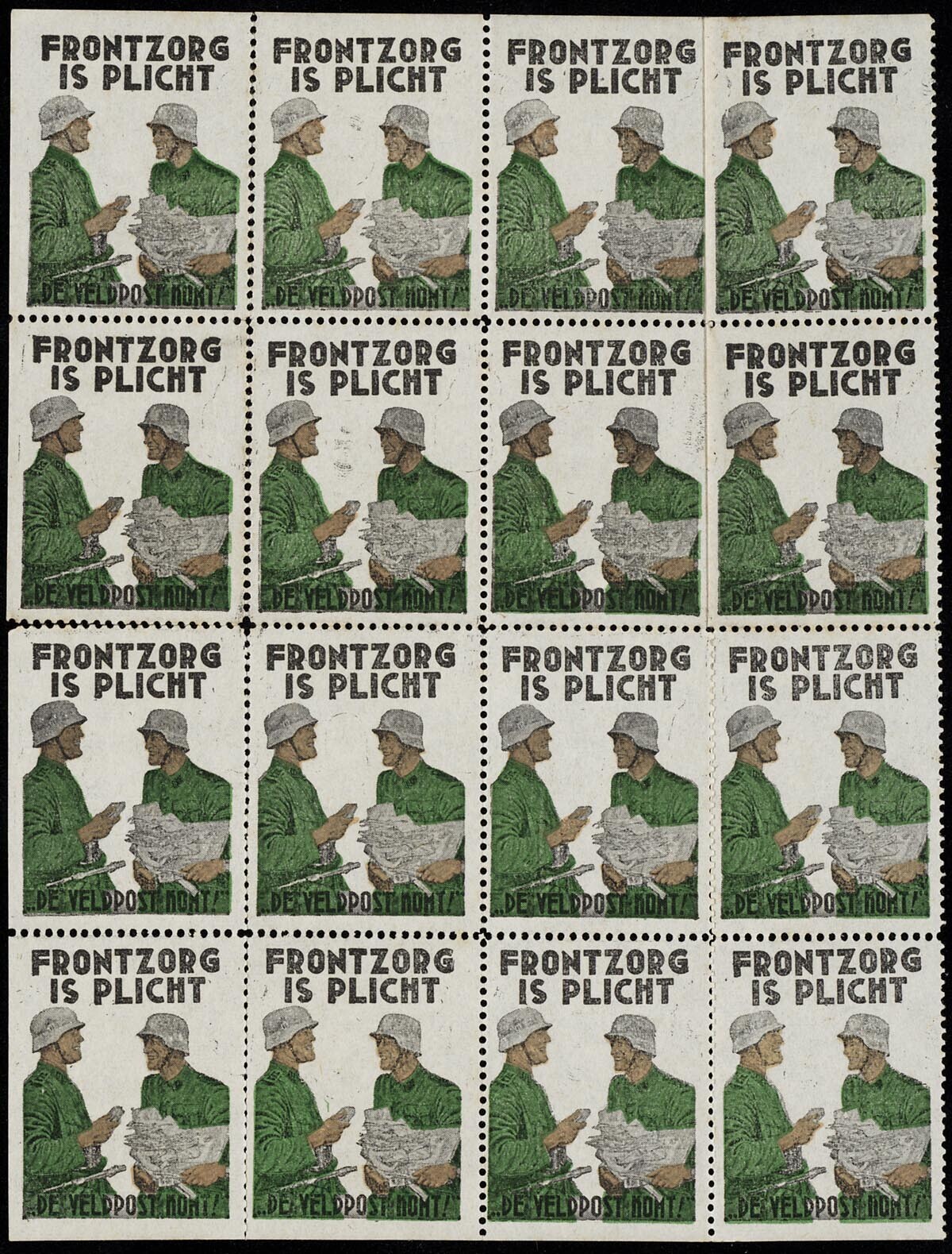 Een vel van 16 postzegels met de afbeelding van twee soldaten met post en de tekst: "Frontzorg is plicht. De veldpost komt!".<br>
