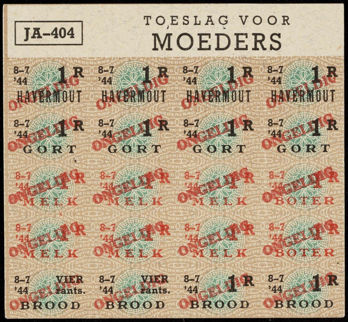 4 vellen met bonnen voor tarwebloem, boter, melk, brood, havermout en gort. De vellen zijn genummerd: - JA-507 Toeslag voor Moeders; - JA-404 Toeslag voor Moeders 8-7 '44; - JA-401 Toeslag voor Moeders 15-4 '44; - JA-407 Toeslag voor Moeders 30-9 '44.