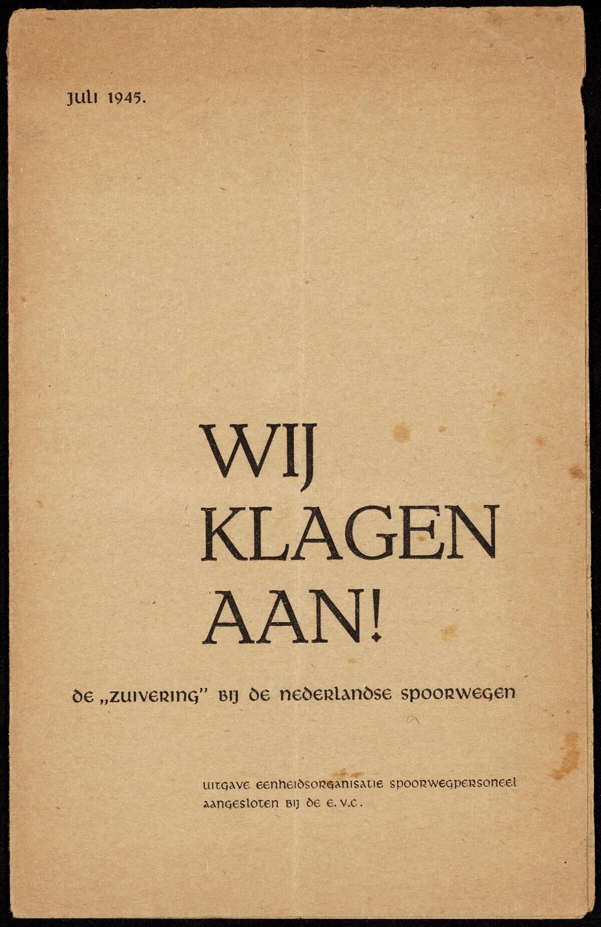 Een gedrukt boekje met op de kaft: "Juli 1945. Wij klagen aan! De 'zuiveringen' bij de Nederlandse spoorwegen".