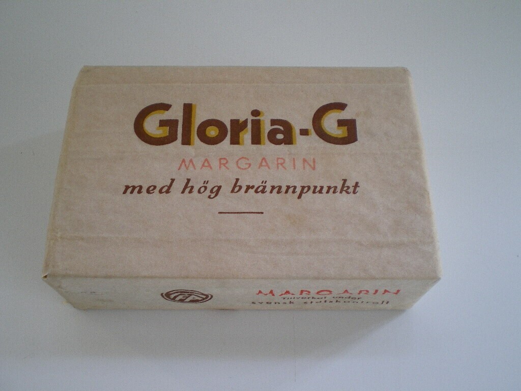 Margarineverpakking van vetvrijpapier. Op het papier staat gedrukt in bruin, geel en rood o.a.: "Glora-G Margarin med hög Brännpunkt - Margarin Tillverkat under Svensk statskontroll - Vitaminhalten star under regelbunden kontroll av Stockholms Högskolas Biokemiska Institut'.