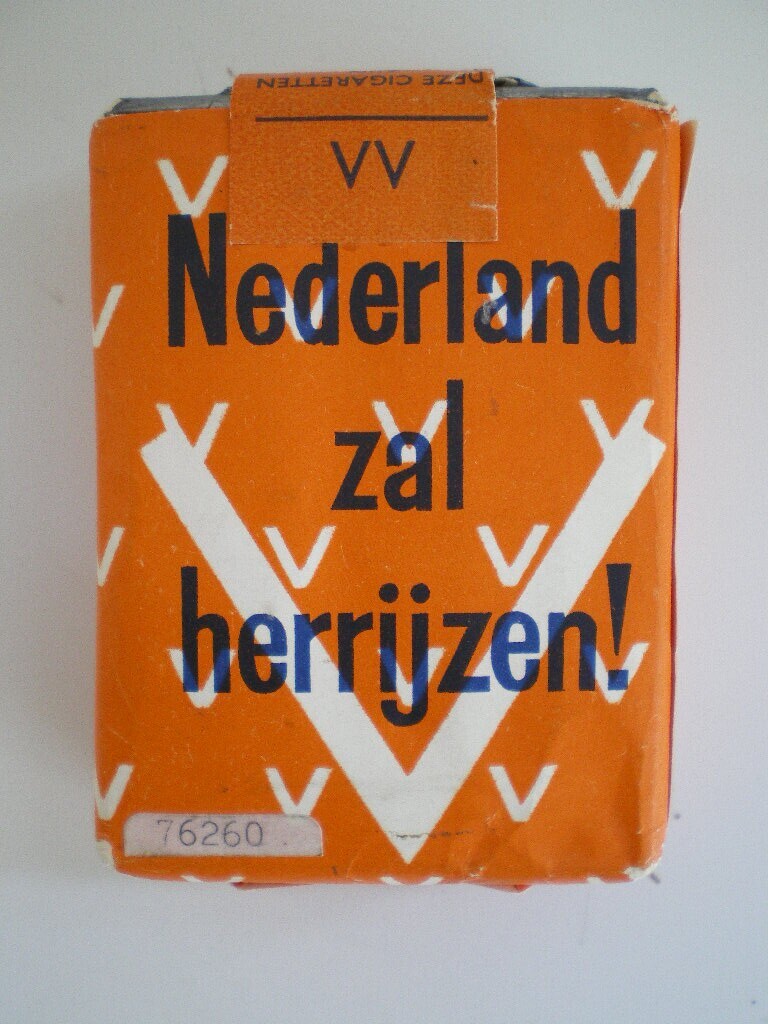 Een pakje sigaretten met een oranje wikkel dat werd afgeworpen boven Nederland door geallieerde vliegtuigen op of omstreeks Koninginnedag 1941. Op het pakje staan kleine witte V's en in blauw gedrukt: "Nederland zal herrijzen!". Op de achterkant, eveneens in blauw gedrukt, een bekroonde 'W' als symbool voor koningin Wilhelmina met de datum: 31 augustus 1941. Op de zijkanten: "Oranje zal overwinnen!". Het pakje is niet aangebroken. Op de intacte oranje banderol: "Deze cigaretten zijn vervaardigd uit Nederlandsch Indische tabak".