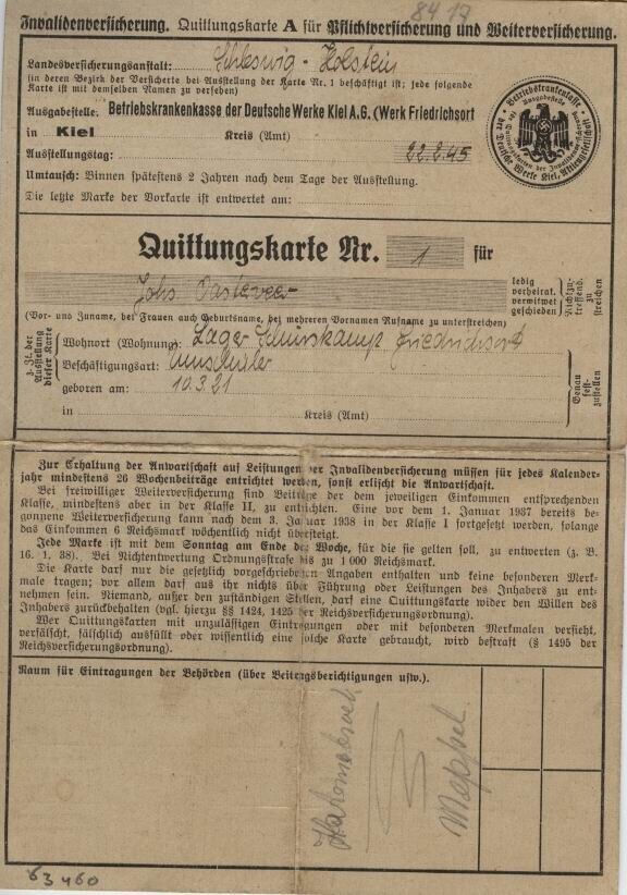 Een gedrukte verzekeringskaart op naam van Johannes Oosterveer, geboren op 10 maart 1921 met bovenaan: "Invalidenversicherung. Quittungskarte A für Pflichtversicherung und Weiterversicherung" uitgegeven op 22 februari 1945 door de "Landesversicherungsanstalt: Schleswig-Holstein". Het gaat om de "Betriebskrankenkasse der Deutsche Werke Kiel A.G. (Werk Friedrichsort) in Kiel. De houder is ondergebracht in: "Lager Sc...(?)kamp, Friedrichsort".