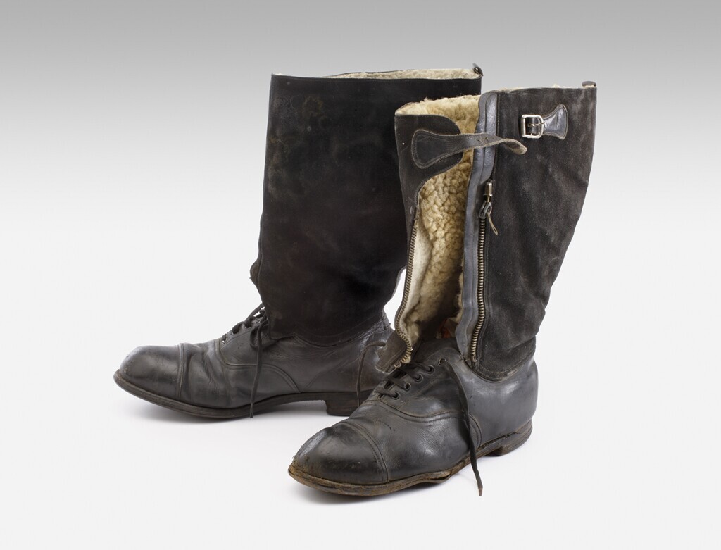 Een paar zwarte leren met schapenbont gevoerde gevoerde R.A.F.-vliegenierslaarzen. De laars is een zogenaamde "Escape Booth". Wanneer de schacht wordt afgesneden, ziet het resterende deel er als een "gewone" schoen uit. Bij de laarzen hoort een mesje. Dit ontbreekt bij dit paar.