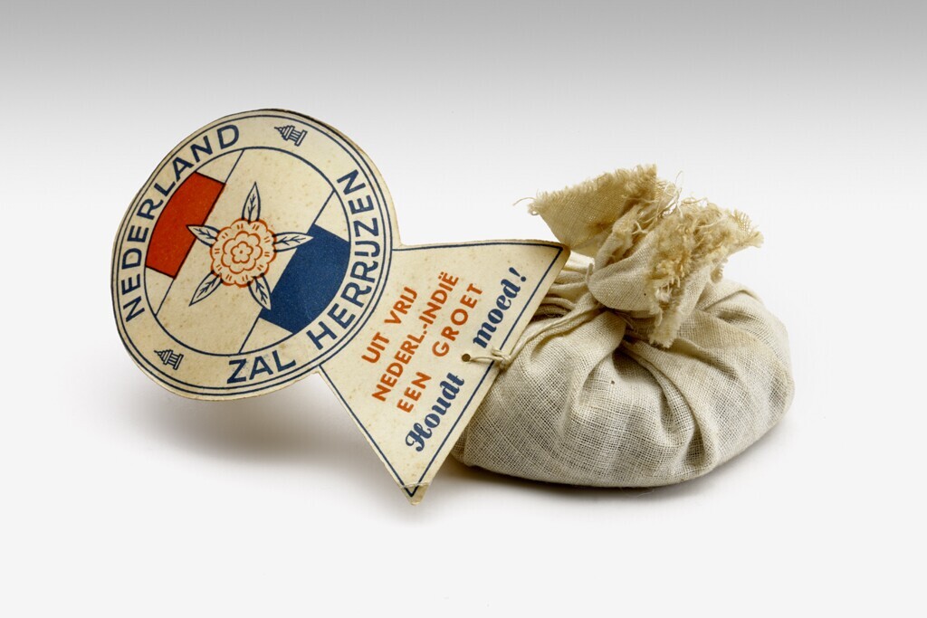 Een zakje met Indische thee, dat door de geallieerden in de zomer van 1941 vanuit de lucht boven bezet Nederlands gebied werd uitgeworpen. Op het etiket: "Nederland zal herrijzen - uit vrij Nederl.-Indië een groet - houdt moed!".<br>De ook in het bezette Nederland veel gehoorde kreet 'Nederland zal herrijzen’ was een vondst van gouverneur-generaal Van Starkenborgh. Tijdens een toespraak voor de radio op 15 mei 1940 had de landvoogd de kreet voor het eerst gebruikt.