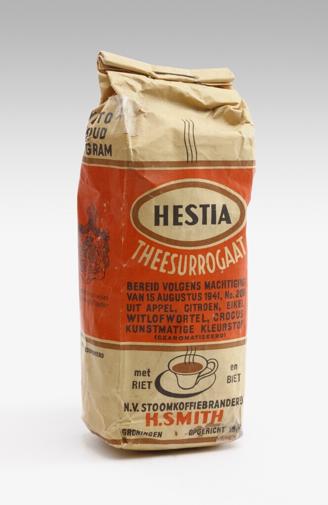 Een papieren pak gevuld met theesurrogaat. Op het pak is een brede rode band gedrukt met aan de voor- en achterkant: "Hestia theesurrogaat bereid volgens machtiging van 15 augustus 1941, No. 206 uit appel, citroen, eikel, witlofwortel, crocus, kunstmatige kleurstof (gearomatiseerd)". Op de zijkant is het wapen van Nederland gedrukt met: "Hofleverancier van wijlen H.M. de Koningin Moeder". Onder de band aan voor- en achterkant de afbeelding van een kopje 'koffie' en: "Met riet en biet. N.V. Stoomkoffiebranderij H. Smit. Groningen. Opgericht 1855". Bovenaan op de zijkant: "Netto inhoud 100 gram".
