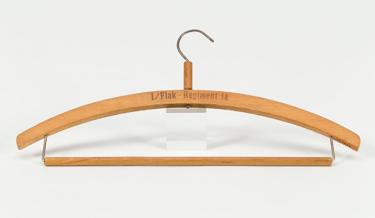 Een klerenhanger van hout en metaal. Op de klerenhanger de tekst: "I/Flak - Regiment 14. behoorde aan de manschappen die ingezet werden voor het Flugzeugabwehrkanon (Flak).