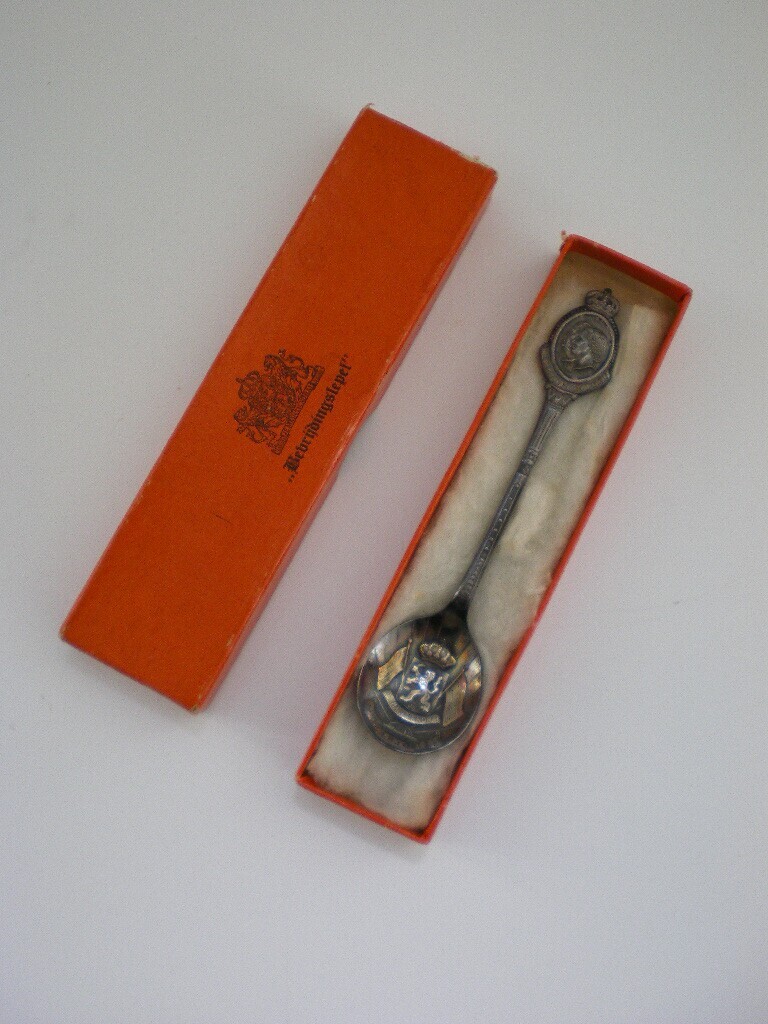 Een oranje langwerpig doosje met daarin een lepel. Op het doosje staat het wapen van Nederland met daaronder: "Bevrijdingslepel". Bovenaan op het handvat van de lepel in een bekroond medaillon de portretten van Juliana en Bernard afgebeeld en profil van links gezien en daaronder: "Nederland en Oranje". Op de schep aan de voor- en achterkant het Nederlandse Rijkswapen daaronder: "1945 5 mei 1955".