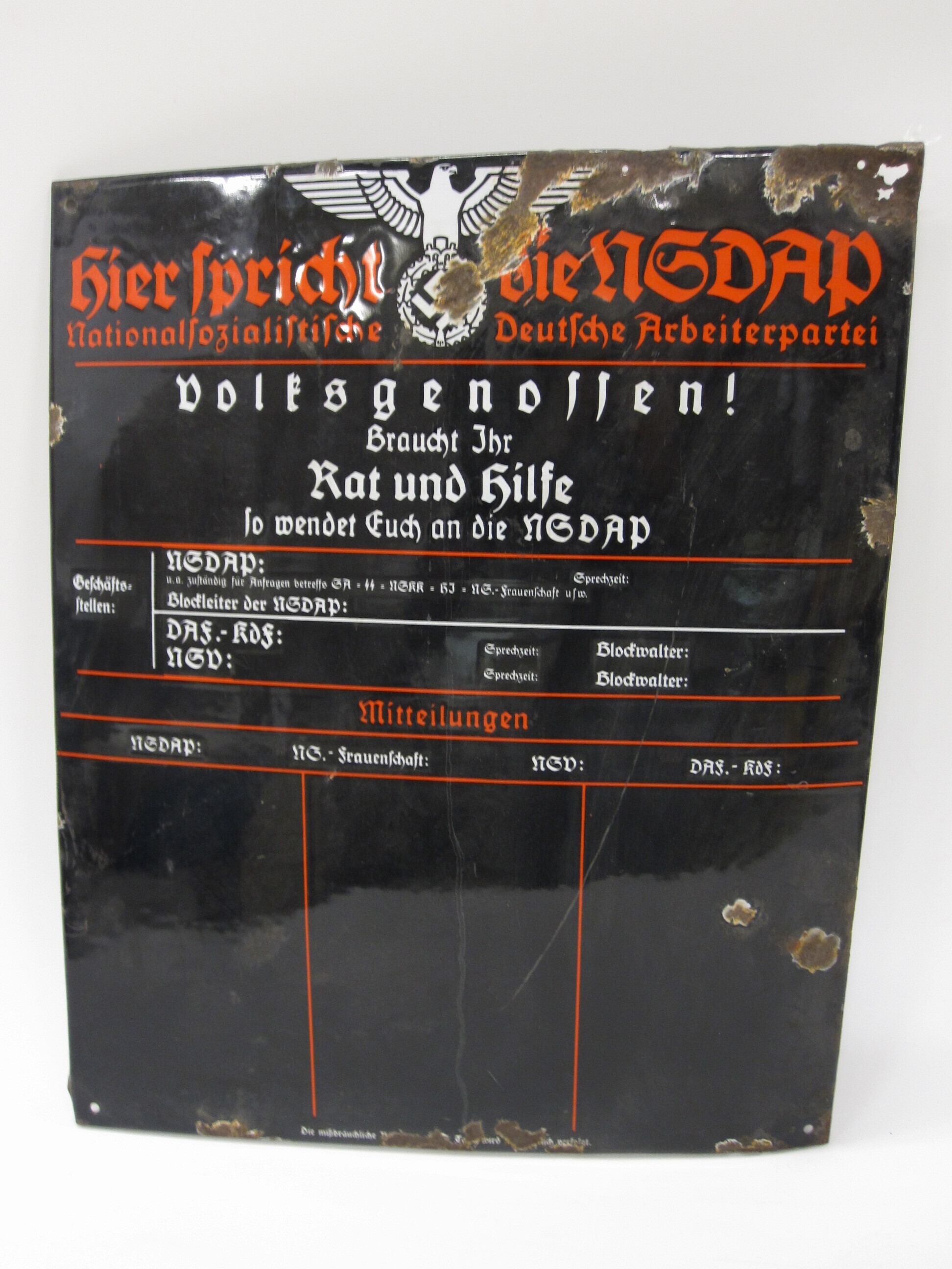 Een rechthoekig zwart geëmailleerd metalen bord met in rode en witte gotische letters de volgende tekst: "Hier spricht die NSDAP, Nationalsozialistische Deutsche Arbeiterpartei: Volksgenossen! Braucht ihr Rat und Hilfe so wendet euch an die NSDAP!".