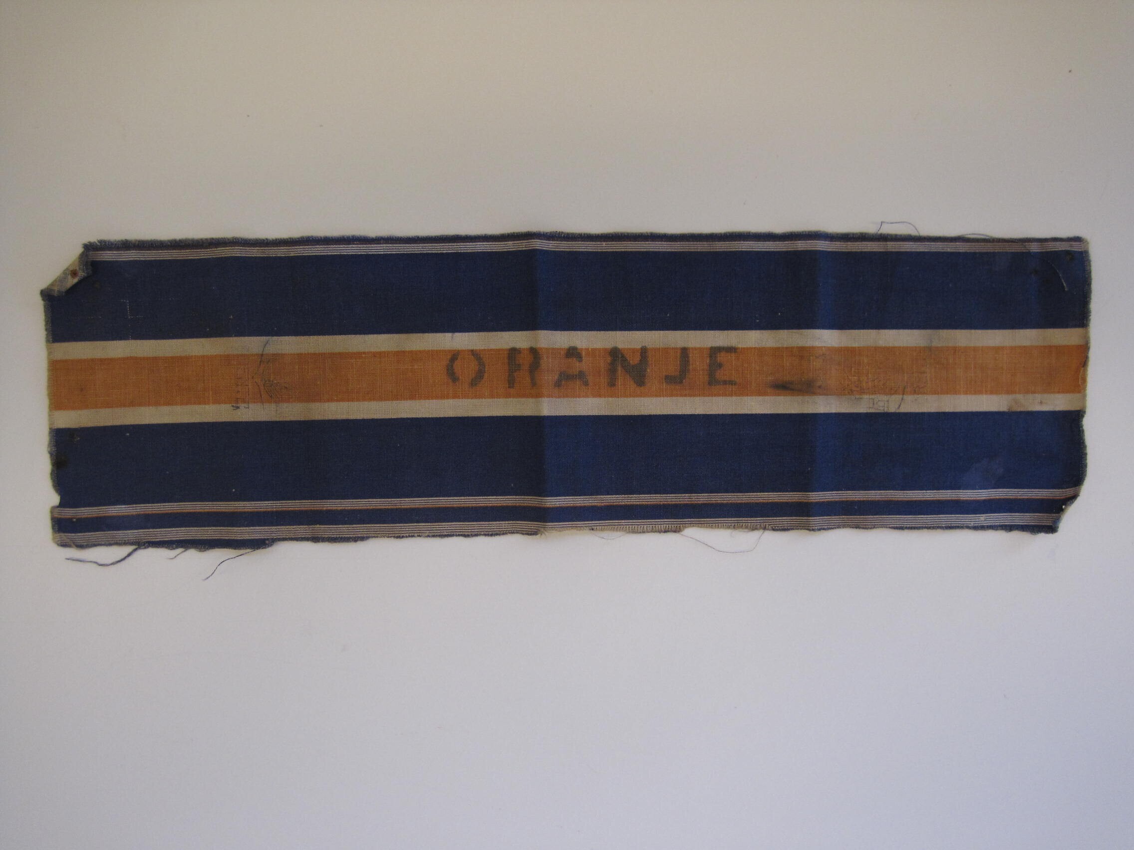Een mouwband van textiel met horizontale banen in de kleuren blauw, wit en oranje. In zwarte sjabloonletters: "Oranje”. Links een onleesbaar blauw stempel. Waarschijnlijk gedragen door een lid van de Orde Dienst.