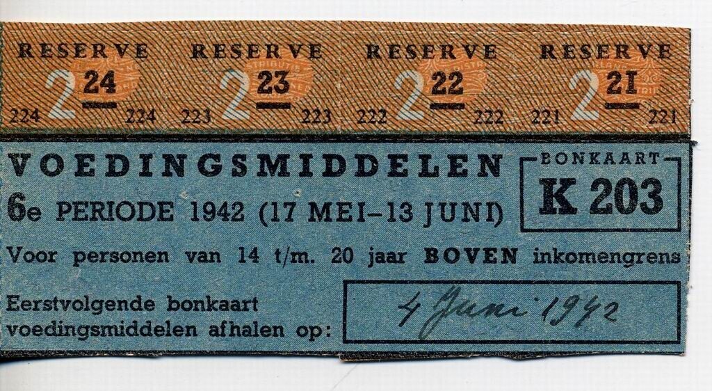 Gedeelte van een gebruikte bonkaart K 203 - Voedingsmiddelen 6e periode 1942 - (17 mei - 13 juni) voor personen van 4 t/m 20 jaar boven inkomengrens. - met zwarte, oranje en blauwe opdruk.