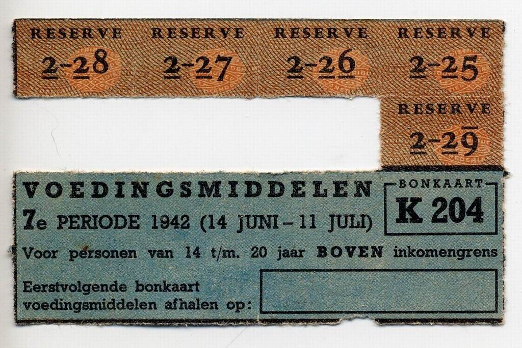 Gedeelte van een gebruikte bonkaart K 204 - Voedingsmiddelen 7e periode 1942 - (14 juni - 11 juli) voor personen van 4 t/m 20 jaar boven inkomengrens. - met zwarte, oranje en blauwe opdruk.