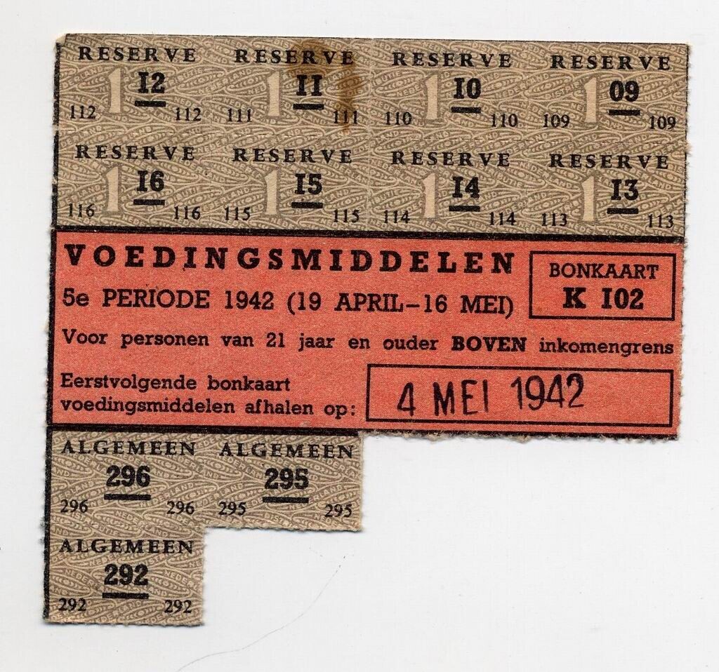 Gedeelte van een gebruikte bonkaart K 102 - Voedingsmiddelen 5e periode 1942 (19 april - 16 mei) - Voor personen van 14 t/m 20 jaar boven inkomengrens. - met zwarte en roze opdruk.