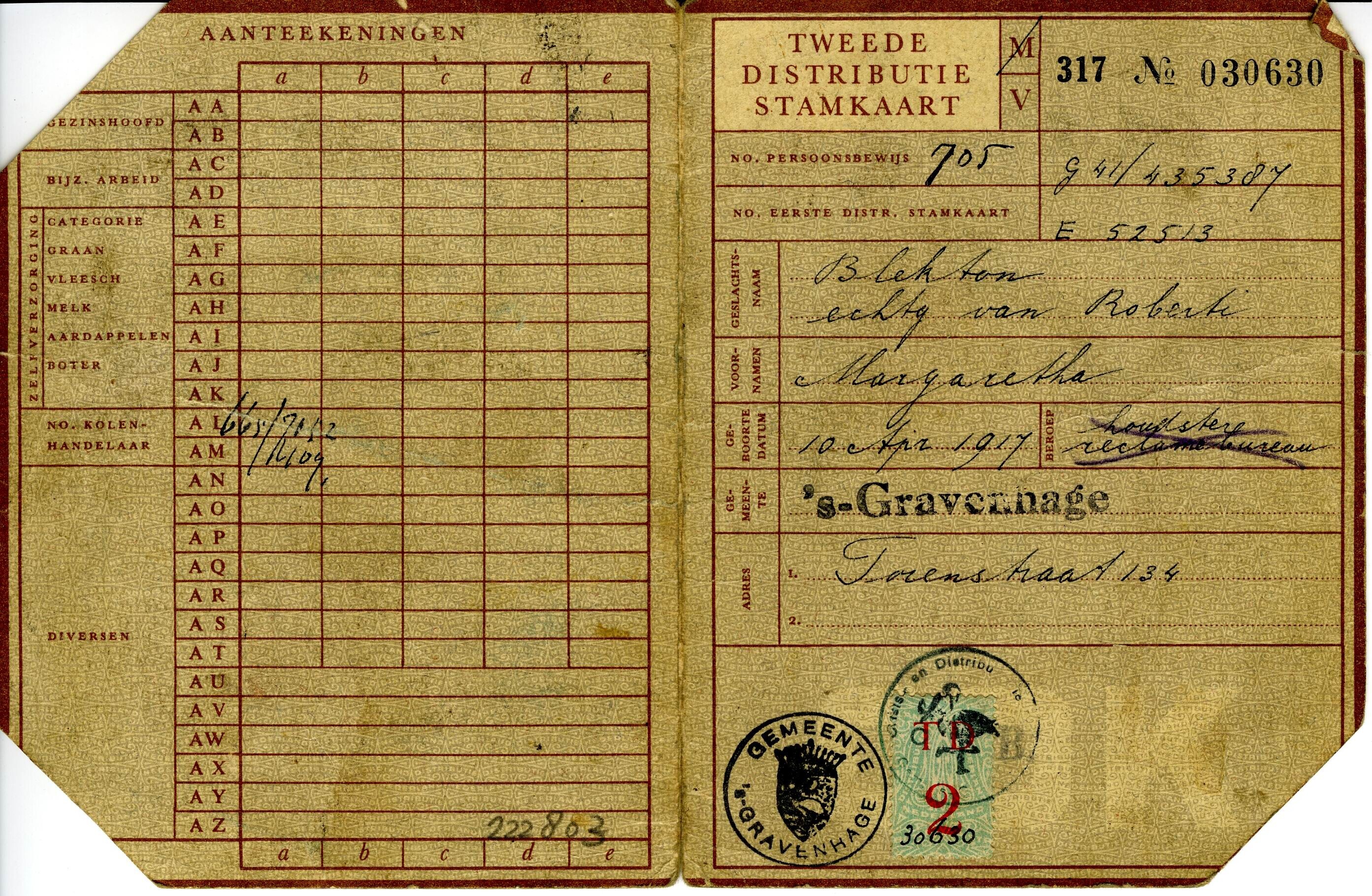 Een "Tweede Distributie Stamkaart" uitgegeven te Den Haag. Het bewijs is gesteld op naam van Margaretha Blekton, echtgenote van Roberti, geboren op 10 april 1917 en wonende in de Torenstraat 134 te Den Haag. In deze kaart staan de uitgereikte bonnen en bonkaarten genoteerd. De kaart draagt het stempel van de gemeente Den Haag.