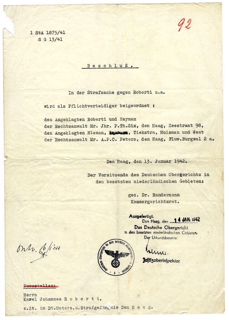 Een getypte verklaring met kenmerk: 1 STA 1875/41 S.G. 13/41 van een in het Duits opgesteld gerechtelijk besluit waarbij de verdachte Roberti en medeverdachten advocaten krijgen toegewezen. Het gaat om advocaten Mr.Jhr.P.Th. Six en Mr. A.P.C. Peters. De verklaring is gedagtekend: Den Haag op 13 Januari 1942 en 'Ausgefertigt' te Den Haag op 14 Januari 1942. De verklaring draagt het stempel met het symbool van het Derde Rijk.