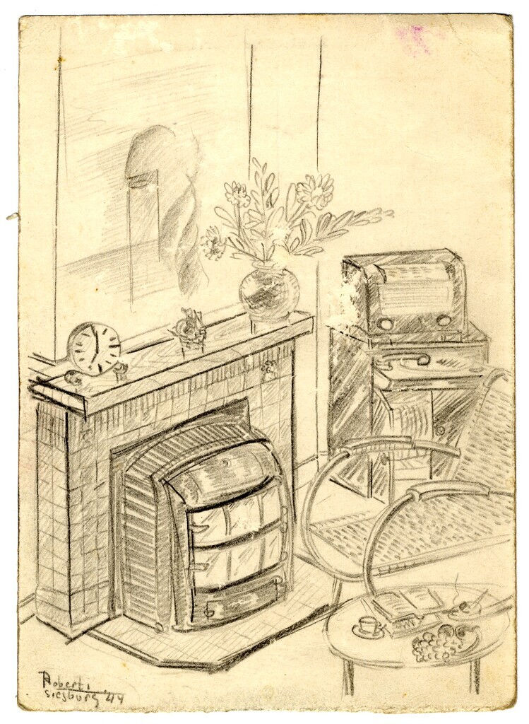 Een potloodschets van een huiskamer met een blik op een zithoek bij de kachel. Een schoorsteenmantel met buikkachel en in een hoek het muziekmeubel voor langspeelplaten met daarop een radio. Linksonder: "Roberti Siegburg '44".