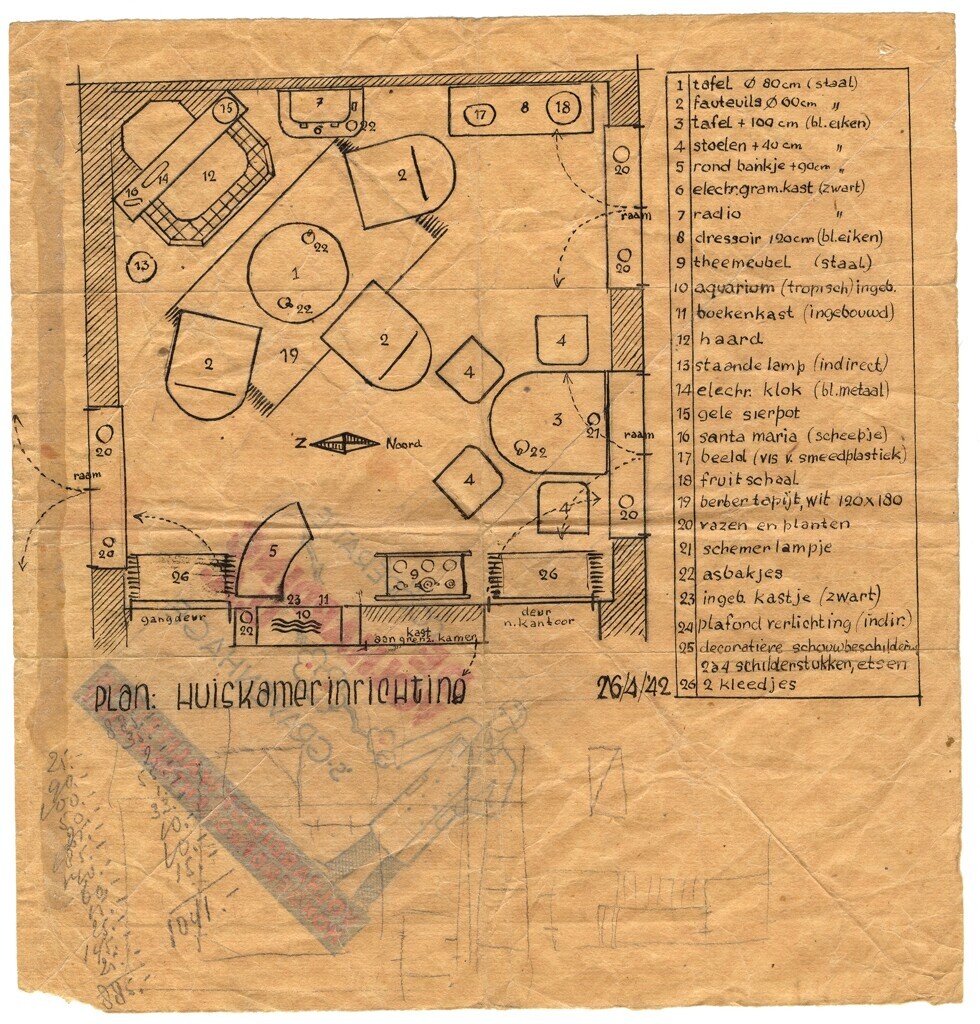 Een pentekening op de achterkant van vetvrij leverancierspapier van de "Coöperatie De Volharding U.A. 's-Gravenhage - Volhardingkwaliteit is honderdprocentkwaliteit". Op het papier is een plattegrond gemaakt voor een Huiskamerinringting met een inrichtingtabel met o.a. meubels en accessoires. Onderaan: "Plan: Huiskamerinrichting 26/4/'42". Linksonder zijn met potlood geldbedragen genoteerd.