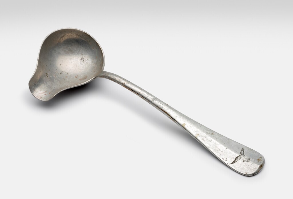 Een zilverkleurige metalen juslepel met het logo van het Derde Rijk.