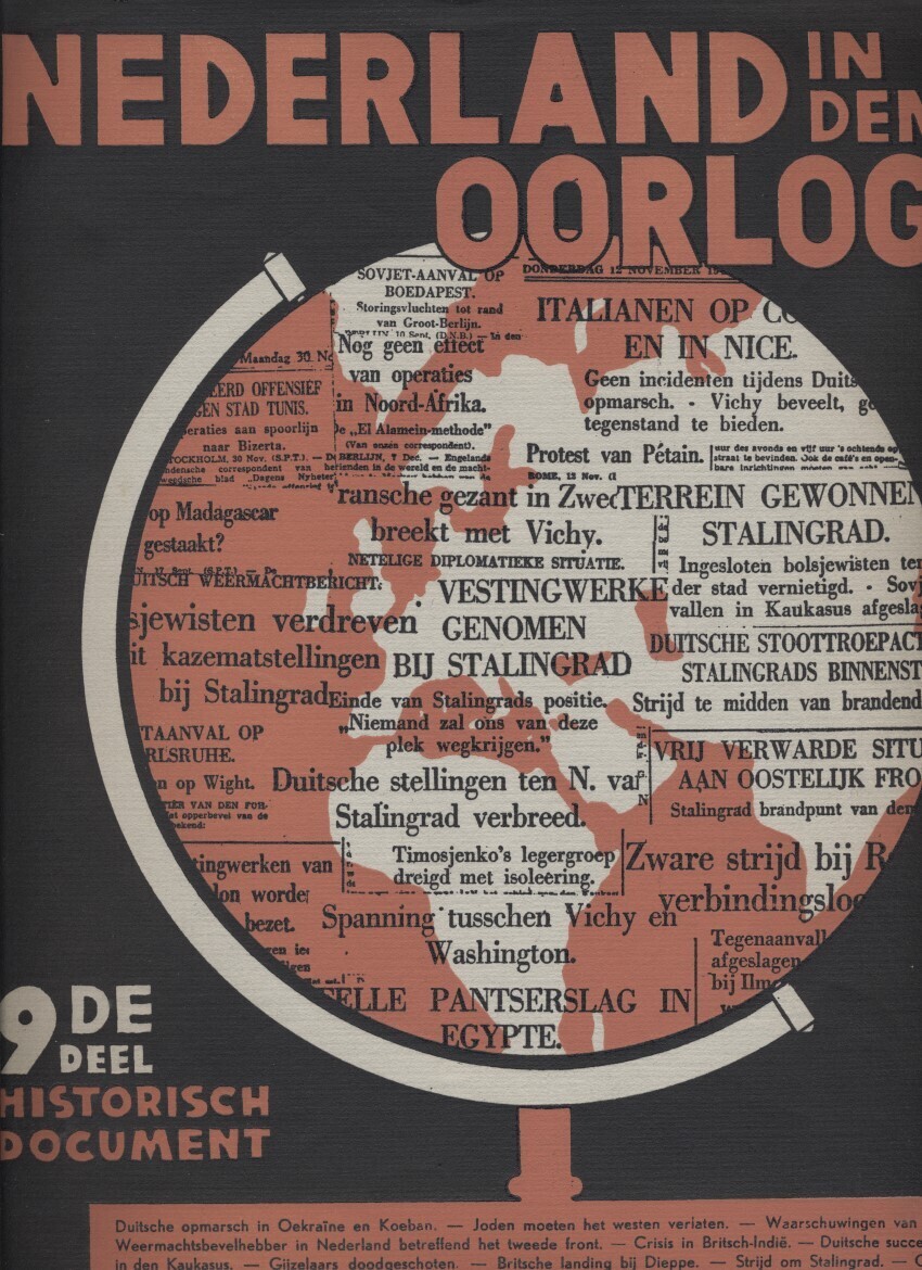 Twee exemplaren van het negende deel van de uitgave "Nederland in den Oorlog! Historisch document met reproducties van officieele stukken". Het geeft een overzicht van de oorlog aan de hand van artikelen uit de Nederlandse kranten en kopieën van originele documenten van augustus tot en met december 1942.