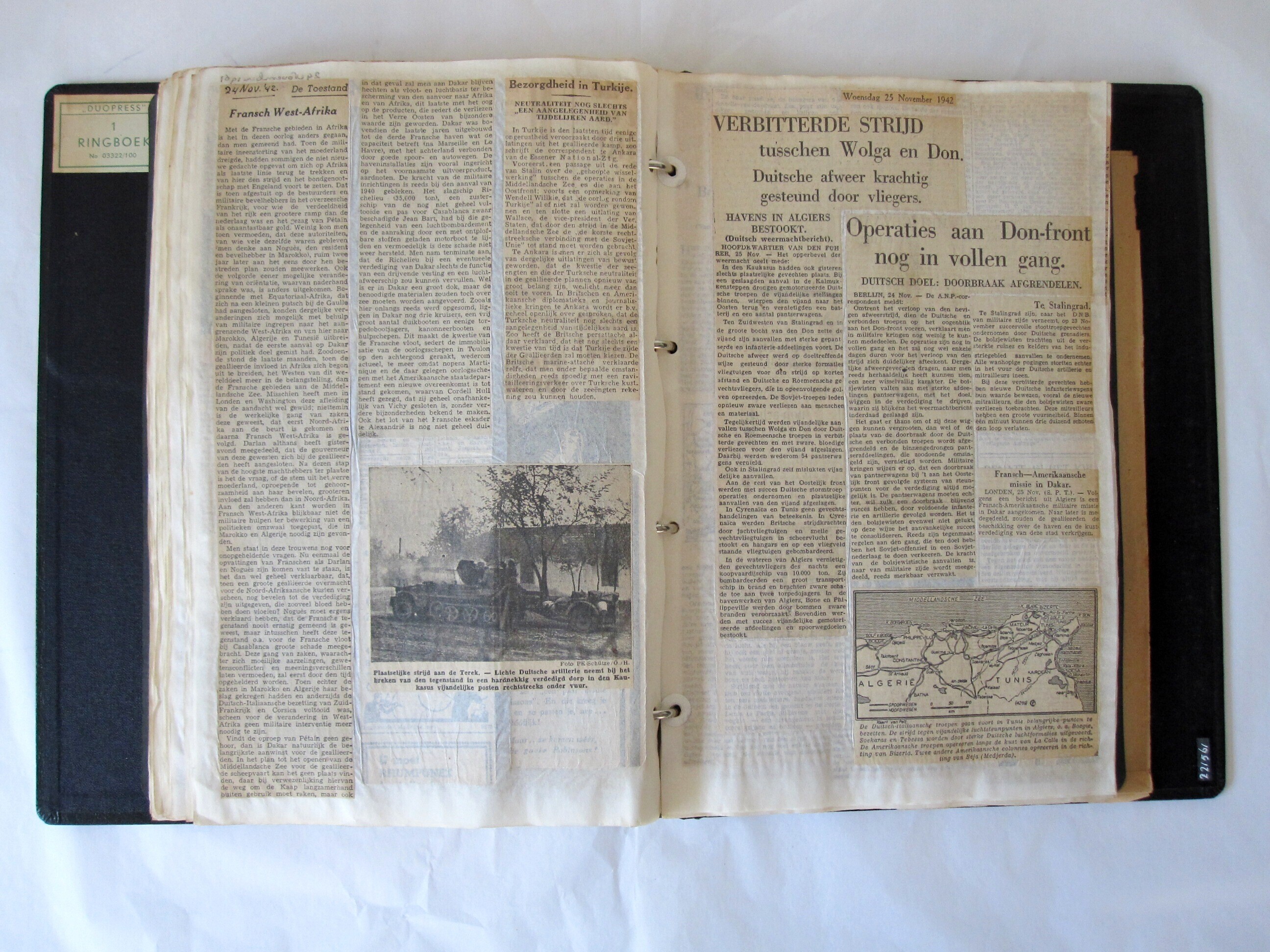 Een 'ringbandalbum' van het merk "Duopress" met een zwarte kartonnen kaft. Op de rug de titel: "Buitenland 2 Juli 1942 - 31 December 1942". In het album zijn op doorzichtige vellen papier krantenknipsels geplakt die gaan over alles wat met deze periode van de oorlog te maken heeft. <br><br>