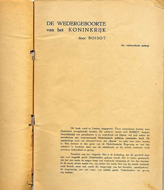 Illegale uitgave van een door Boisot geschreven en oorspronkelijk in Engeland gepubliceerde boekje. Het boekje omvat 17 pagina's.