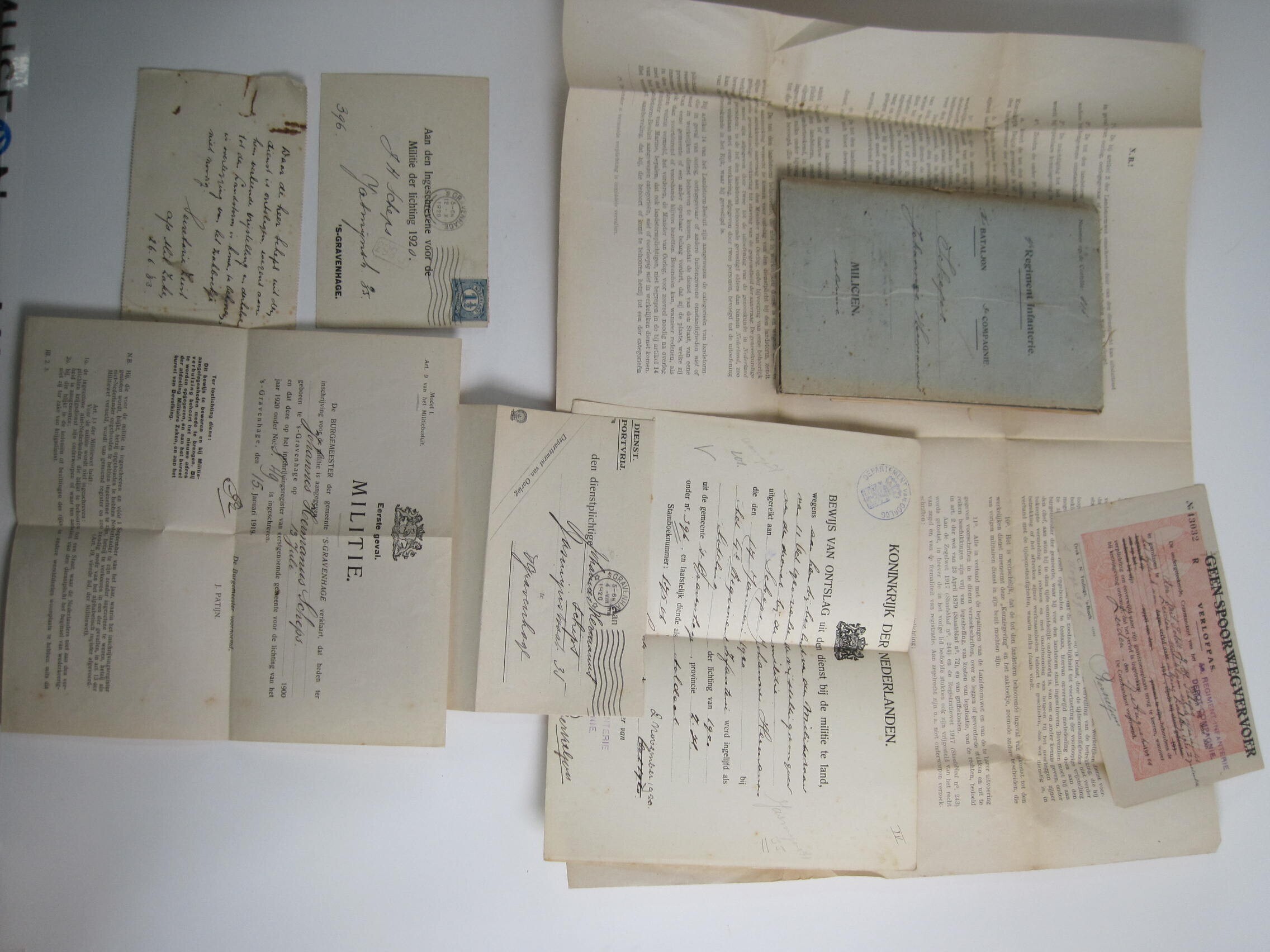 Een aantal documenten betreffende de inlijving, vervulling en vrijstelling van militaire dienst van de heer H. Scheps waaronder verklaringen, een militair zakboekje en een veldzakboekje.