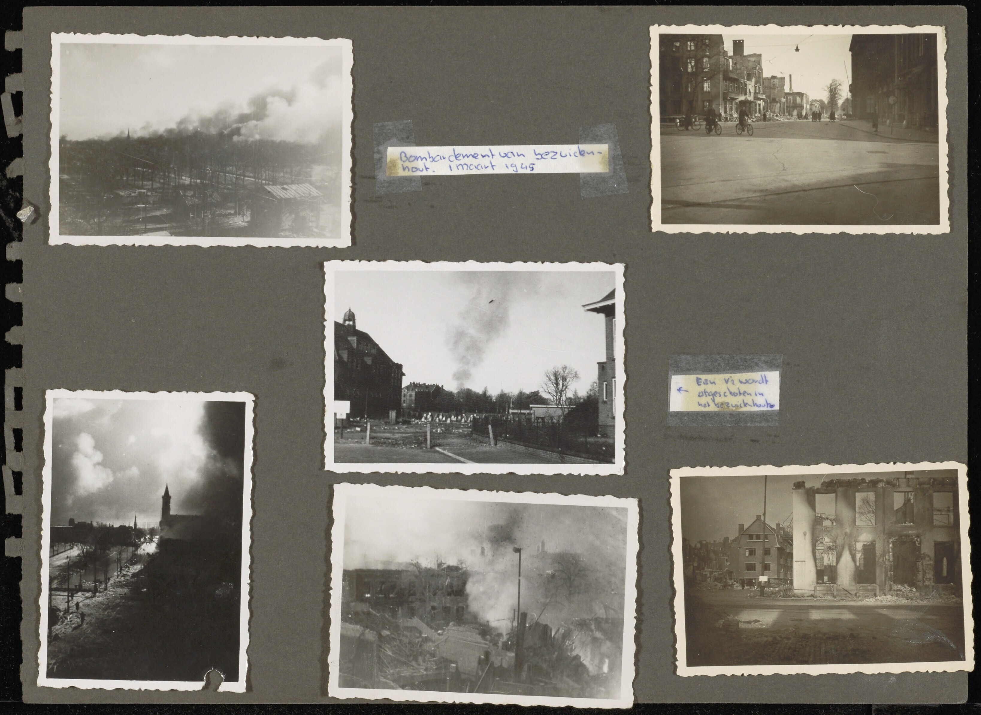Een los blad uit een fotoboek met aan beide kanten zwart-wit foto's over de laatste maanden van de oorlog en de bevrijding in Den Haag. Later zijn bijschriften toegevoegd. Op één kant vijf foto's van het bombardement van het Bezuidenhout op 3 maart 1945 en een foto van een V2 afgeschoten "in het Bezuidenhout". Op de andere kant een foto van een brand op straat met bijschrift: "Wraak v.d. Nederlanders op het NSB-hoofdkantoor aan het Spui. Den Haag"; een foto van kaalgeschoren vrouwen die een relatie hadden met Duitse militairen; een foto van de voorkant van het krantje "de Vliegende Hollander" met de kop: "Russen vechten in Berlijn"; een foto van geallieerde tanks rijdend over de laan van Meerdervoort bij het Valkenbosplein en een foto van een voedseldropping boven Den Haag.
