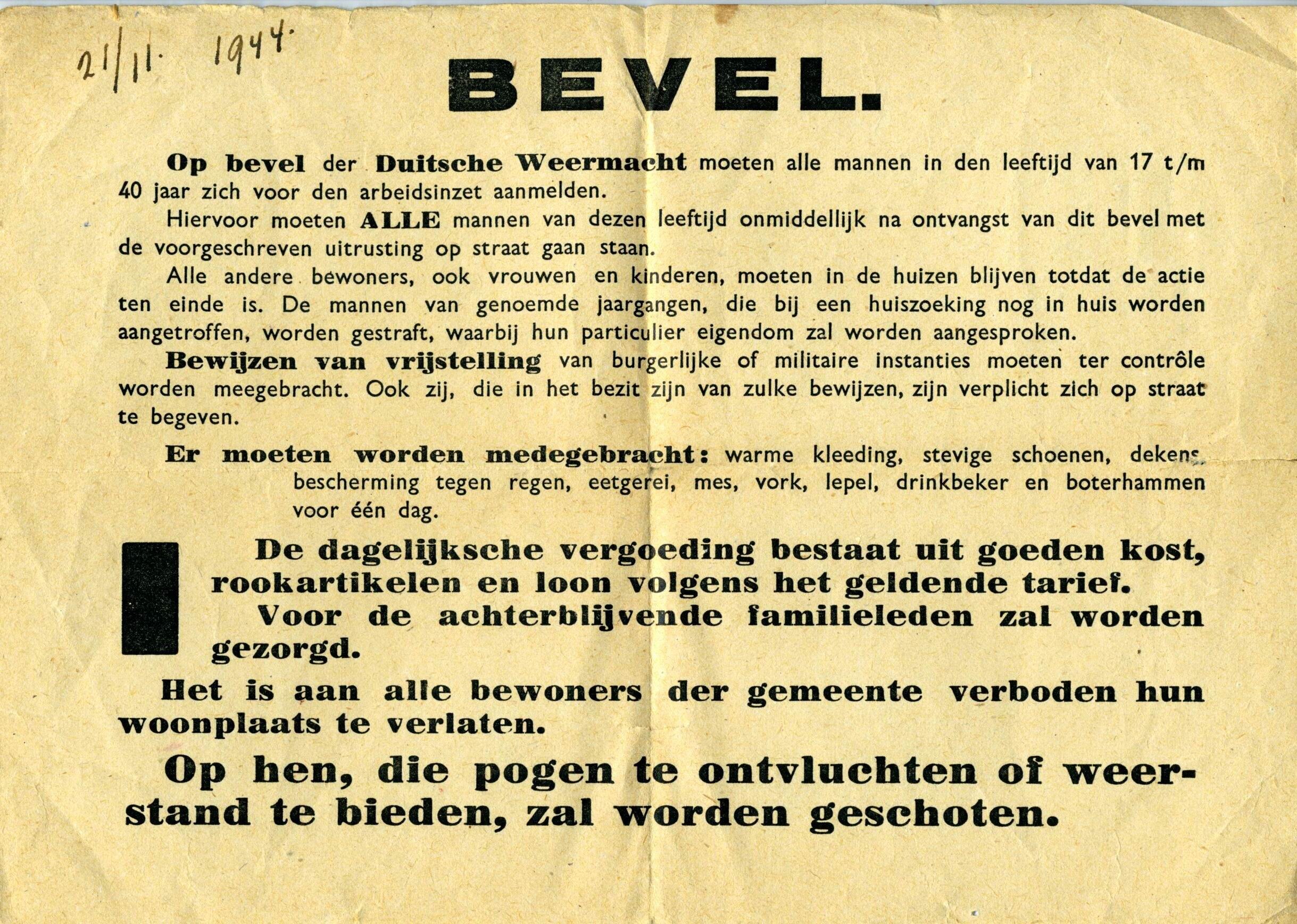 Een gedrukt pamflet met als kop "Bevel" waarin op bevel van de Duitse "Weermacht" alle mannen in de leeftijd van 17 tot en met 40 jaar worden opgeroepen zicht te melden voor de arbeidsinzet.