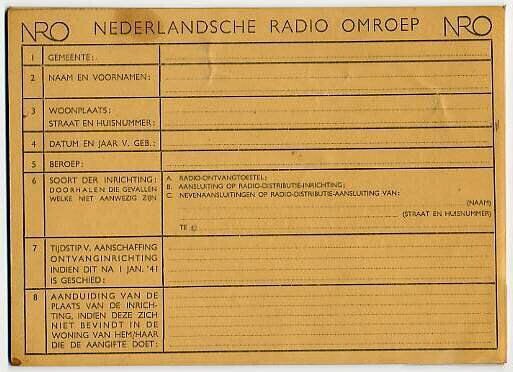 Ongebruikt formulier, waarmee men het bezit van een radio kon aanmelden. De envelop waarin dit formulier huis aan huis werd verspreid is eveneens aanwezig, alsmede de retourenvelop. Aangifte was verplicht krachtens de verordering van de Rijkscommissaris van 19 december 1940.