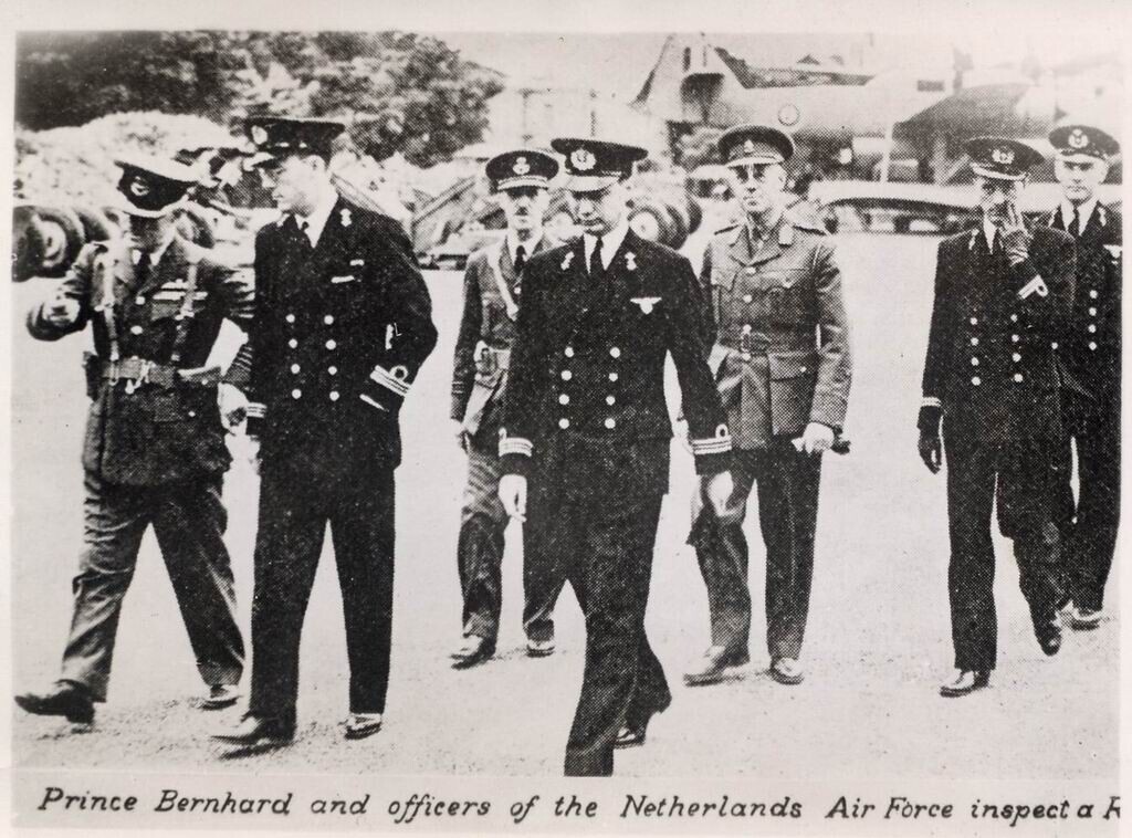 Foto van prins Bernard met Nederlandse luchtmachtofficieren op een Britse luchtbasis. Met Engelstalig onderschrift.