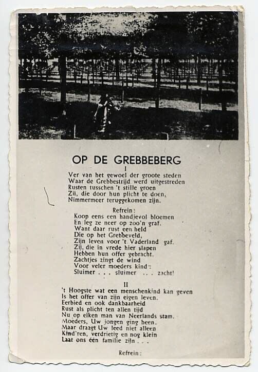 Foto van de oorlogsgraven op de Grebbeberg met daaronder de tekst van een lied.