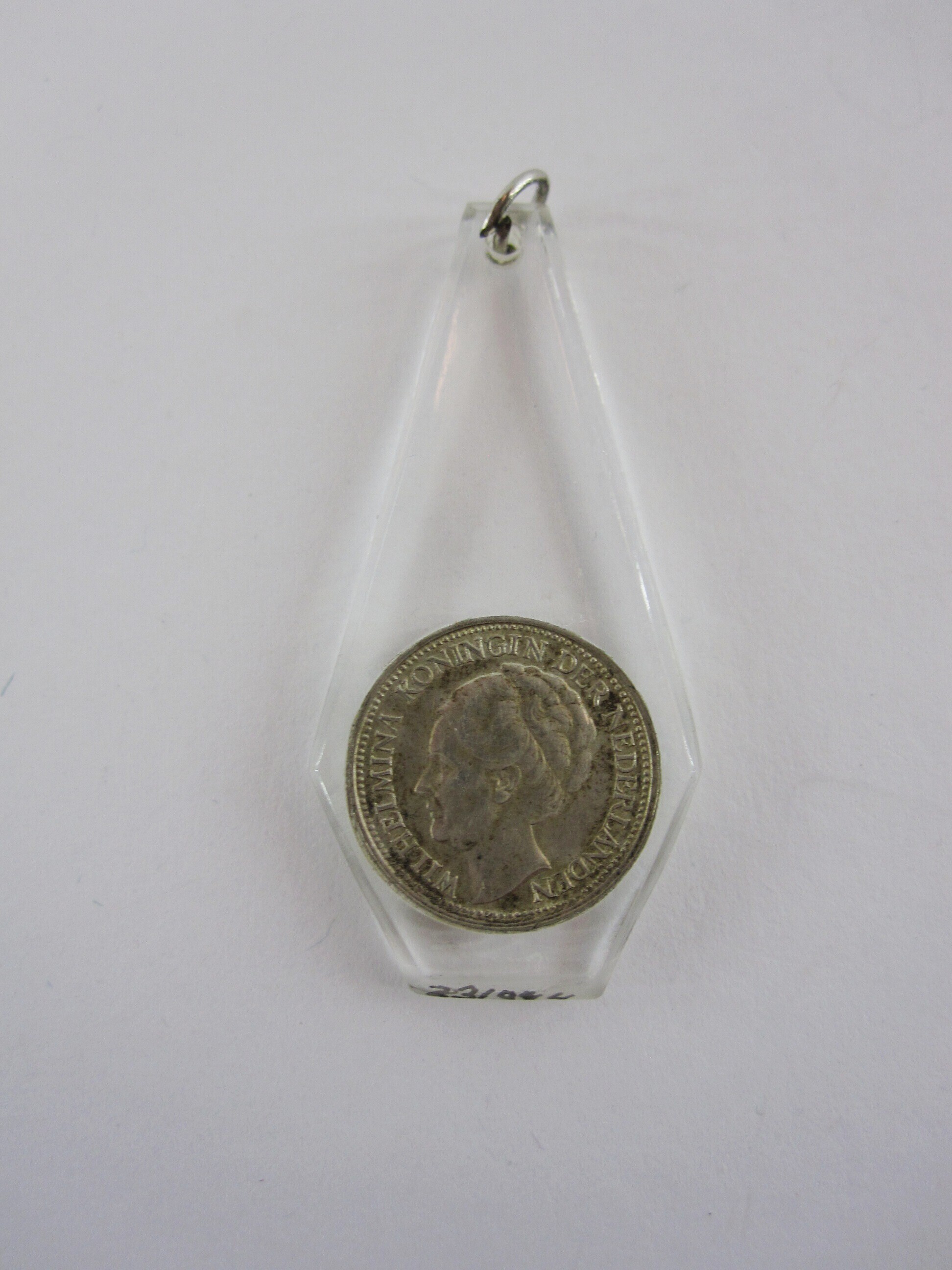 Een langwerpige hanger gemaakt transparant kunststof met een metalen oogje aan de bovenkant. In de hanger zijn twee zilveren dubbeltjes gevat die tegen elkaar zijn aangezet, zodat aan beide kanten van de hanger het portret van "Wilhelmina koningin der Nederlanden" zichtbaar is. Mogelijk is de kunststof zetting van later datum.